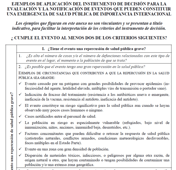 Por otra parte, hay voces que han sido acalladas por el señalamiento que han hecho sobre el cambio que se hizo al Reglamento Sanitario Internacional, RSI, para declarar una Emergencia Sanitaria Internacional. Analicemos el siguiente cuadro tomado del RSI de 2005 (pág. 62):