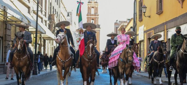 El ejecutivo estatal montó a su caballo y comenzó el desfile, avanzando por la calle de Álvaro Obregón hasta llegar a la Plaza de los Fundadores, donde, bajo la Bandera monumental de México, presidió el colorido y sonoro desfile junto a la presidenta del DIF Ruth González Silva; el General de Brigada Diplomado de Estado Mayor, Crisóforo Martínez Parra; el alcalde capitalino Enrique Galindo Ceballos; la presidenta del Congreso del Estado, Yolanda Josefina Cepeda Echavarría; la presidenta del Supremo Tribunal de Justicia, Magistrada Olga Regina García López y autoridades estatales.