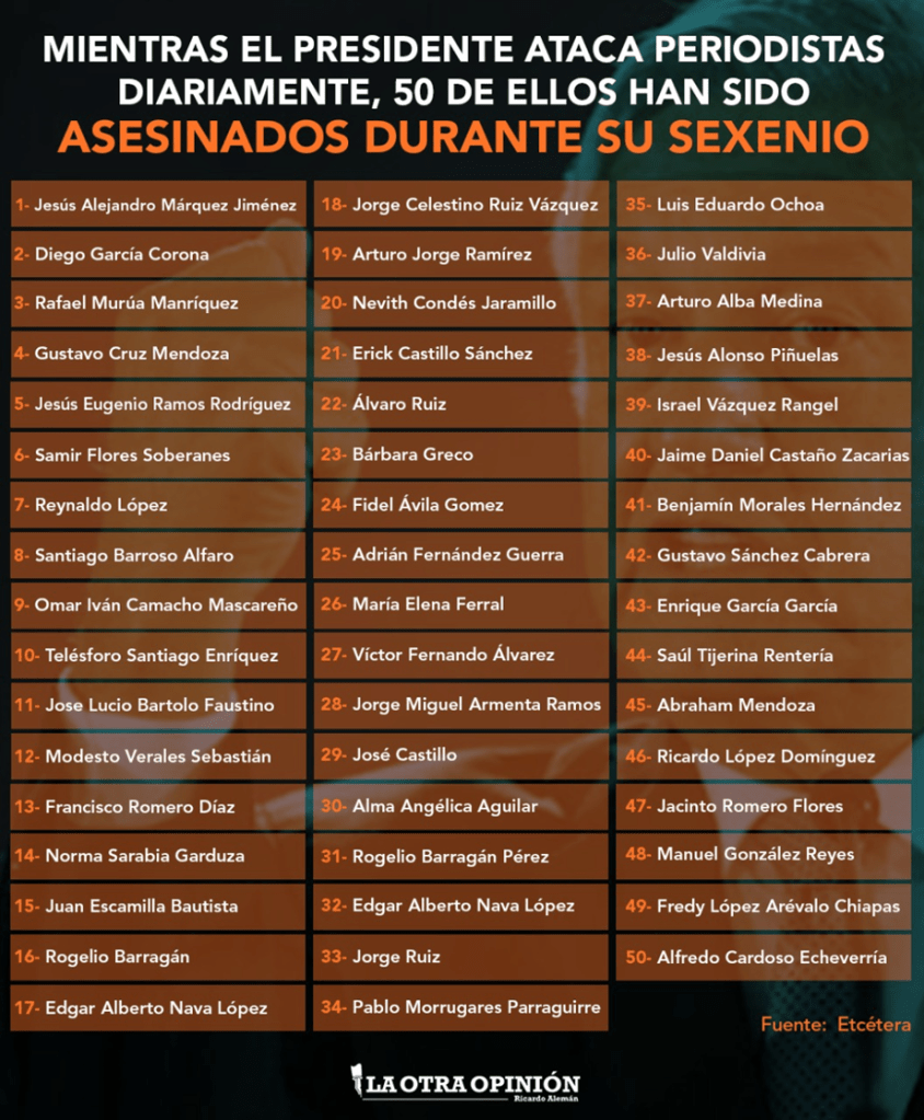 Los diez nombres se suman a los 40 periodistas asesinados en el Gobierno de AMLO, de diciembre del 2018 hasta el pasado 30 de octubre de 2021, 50 periodistas han sido asesinados, además de 94 activistas y la mayoría de estos crímenes están impunes.