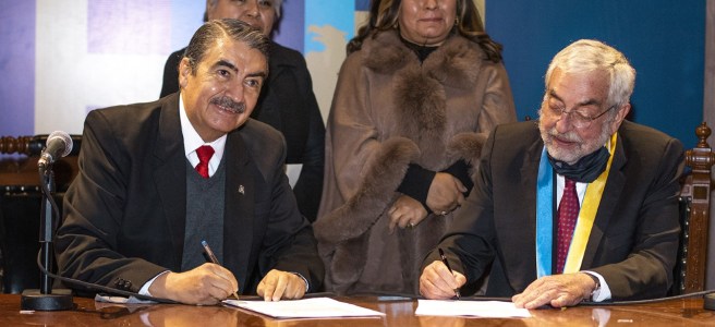 CONVENIO.- La Universidad Autónoma de San Luis Potosí (UASLP) a través de la Facultad de Ciencias de la Información, signó un acuerdo de colaboración con el Posgrado en Bibliotecología y Estudios de la Información de la Universidad Nacional Autónoma de México (UNAM). El rector de la UASLP, Dr. Alejandro Zermeño Guerra y el rector de la UNAM, Dr. Enrique Graue Wiechers, rubricaron el documento que será de gran beneficio para estudiantes y académicos de ambas instituciones de educación superior del país. El objetivo es establecer con la Facultad de Ciencias de la Información de la UASLP un trabajo conjunto de investigación, docencia, movilidad académica, y diversas publicaciones, que permita fortalecer los dos programas de posgrados de las dos instituciones: Maestría en Ciencias de la Información Documental y Maestría en Ciencias de la Información.