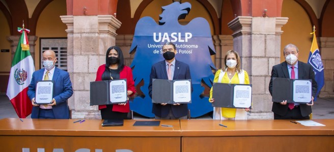 CONVENIO.- La Universidad Autónoma de San Luis Potosí (UASLP) signó un convenio de colaboración institucional en campos de capacitación académica, de investigación y servicios de apoyo, en beneficio de la sociedad, con la sexagésima tercera legislatura del H. Congreso del Estado. El rector, Dr. Alejandro Zermeño, manifestó que el objetivo principal del convenio lleva el eslogan ganar-ganar, donde los alumnos serán recibidos en dicha institución para llevar a cabo procesos de permanente actualización en normativas y leyes: “Como institución educativa podemos ofrecer a los jóvenes una gran preparación teórica y actualización, sin embargo, aprenden más en la práctica; esperamos reciban de ustedes esa energía y nuevos conocimientos”.