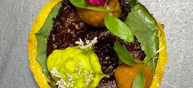 FOTO: Pulpo a las brasas sobre maíz, hoja santa y aguacate.