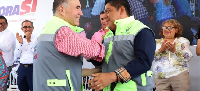 JUNTOS.- Ricardo Gallardo y Enrique Galindo pusieron en marcha la obra de rehabilitación integral de la avenida Ricardo B. Anaya, donde el primero indicó que para mejorar las deplorables condiciones en que se encuentran las vialidades de la ciudad, el Ejecutivo Estatal y el Ayuntamiento de la Capital invertirán alrededor de 3 mil millones de pesos en suma, mientras Galindo afirmó que su gobierno atiende los problemas existentes en las calles de San Luis Potosí, que se han mantenido en el abandono durante más de 30 años, dentro del programa “Vialidades PotoSínas”.