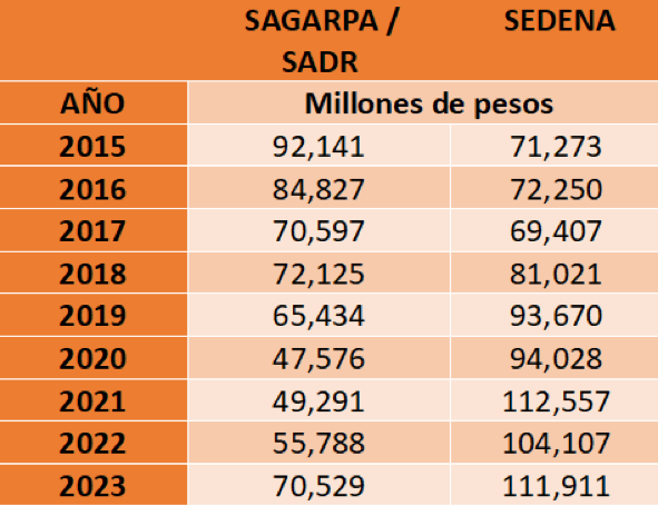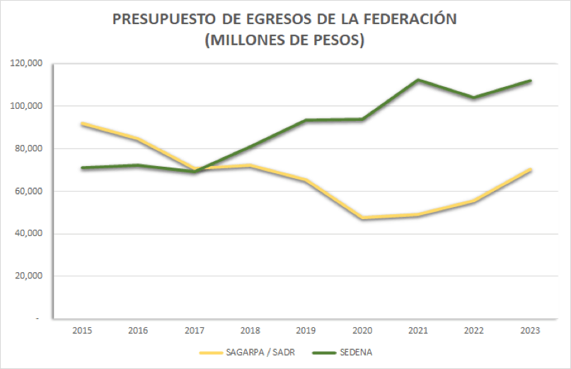 Tocante al prometido rescate del campo y de la autosuficiencia alimentaria que prometió, estamos a años luz de eso. Esta administración como ninguna otra ha abandonado el agro mexicano. En el cuadro[iii] se muestra la evolución del comportamiento de los presupuestos asignados desde 2015 al 2023 a las Secretarías de la Defensa (Sedena), y de Agricultura, Ganadería, Pesca y Alimentación, Sagarpa (2015-2018), ahora Secretaría de Agricultura y Desarrollo Rural, SADR, (2019-2023). La gráfica contrasta la diferencia presupuestal entre ambas dependencias. Tenemos entonces una amplia discrepancia entre lo ofrecido por el candidato y el hoy presidente. Los militares siguen en las calles y, el rescate del campo mexicano para lograr la autosuficiencia alimentaria tendrá que seguir esperando, al igual que nuestros cada vez menos campesinos. Y es que, en los hechos (en los presupuestos que son el principal instrumento de trabajo de las dependencias para llevar a cabo programas y proyectos), la dependencia responsable del agro nacional no ha vuelto a contar con un presupuesto acorde a su tamaño, su potencialidad y sus necesidades. Vemos que en 2015 el Presupuesto de Egresos de la Federación. PEF, destinado a la Sagarpa fue superior a los 92 mil millones de pesos, mientras la Sedena recibía poco más de 71 mil millones. En ese ejercicio presupuestal, la Sedena recibió 20 mil 868 millones menos que Sagarpa. Para este ejercicio 2023, la SADR recibirá 41 mil 382 millones menos que Sedena. Ya que la Sedena ejercerá 111 mil 911 millones de pesos, mientras SADR solo recibirá 70 mil 529 millones de pesos (casi 37% menos).