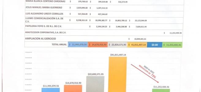En papelería, de los años 2017 al 2020, le vendió al gobierno 58 millones 555 mil 533 pesos; en el 2020 hubo una ampliación al ejercicio (de presupuesto) por más de 10 millones de pesos en beneficio de Lujime Comercialización SA de CV y en menor medida de Papelería Foyo, otra proveedora que habría recibido alrededor de 15 millones de pesos en ese mismo año.