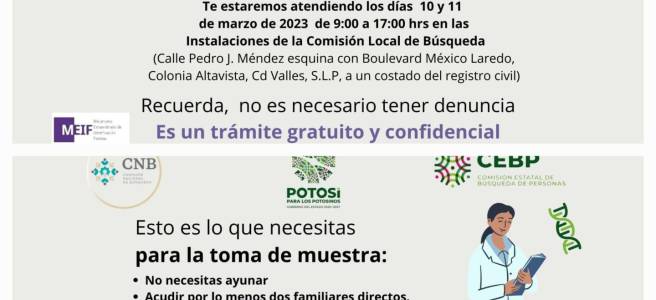 El titular del CEBP, Leobardo Aguilar Orihuela, informó que la jornada se realizará en el municipio de Ciudad Valles de 9:00 a 17:00 horas en las instalaciones de la Comisión Local de Búsqueda, que se localiza en la calle de Pedro J. Méndez esquina con bulevar México Laredo, por lo que recordó que el trámite es gratuito y no es necesario tener denuncia de hechos.