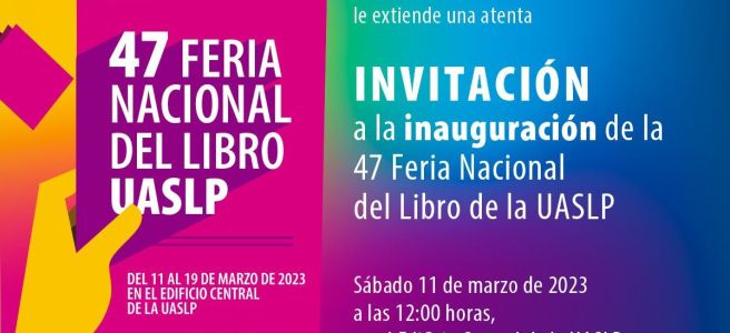 La inauguración de la 47 Feria Nacional del Libro UASLP, tendrá lugar el sábado 11 de marzo de 2023, en punto de las 12:00 horas, la entrada es libre con uso de cubrebocas para todo el público en general, cabe mencionar que todas las actividades y talleres son totalmente gratuitos. Para revisar toda la actividad que se tendrá durante esta edición, puede acceder a la página https://feriadelibro.uaslp.mx/
