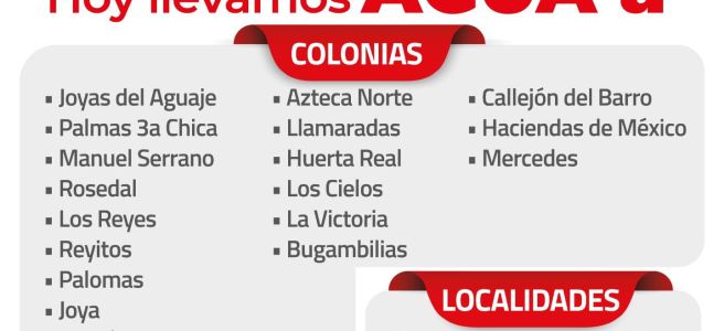 Las colonias que reciben el beneficio este día son: Joyas del Aguaje, Palmas, Tercera Chica, Manuel Serrano, Rosedal, Los Reyes, Reyitos, Palomas, Joya y Orquídea.