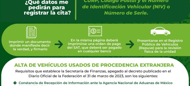 Primero, las y los ciudadanos deberán cumplir con el proceso que opera el Gobierno federal, que consiste en solicitar una cita en la página https://regularizaauto.sspc.gob.mx/ donde deberán escribir su CURP, Código Postal y el Número de Identificación Vehicular (NIV) o Número de Serie.