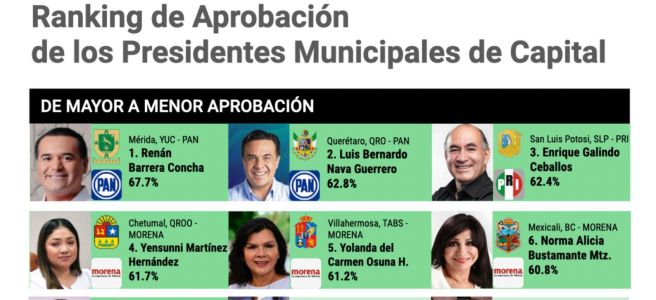 Los resultados que presentó México Elige colocan en primer lugar al Presidente Municipal de Mérida, Yucatán, Renán Barrera Concha, con 67.7 puntos porcentuales; mientras que en segundo lugar aparece Luis Bernardo Nava, de Querétaro, con 62.8 por ciento de aprobación.