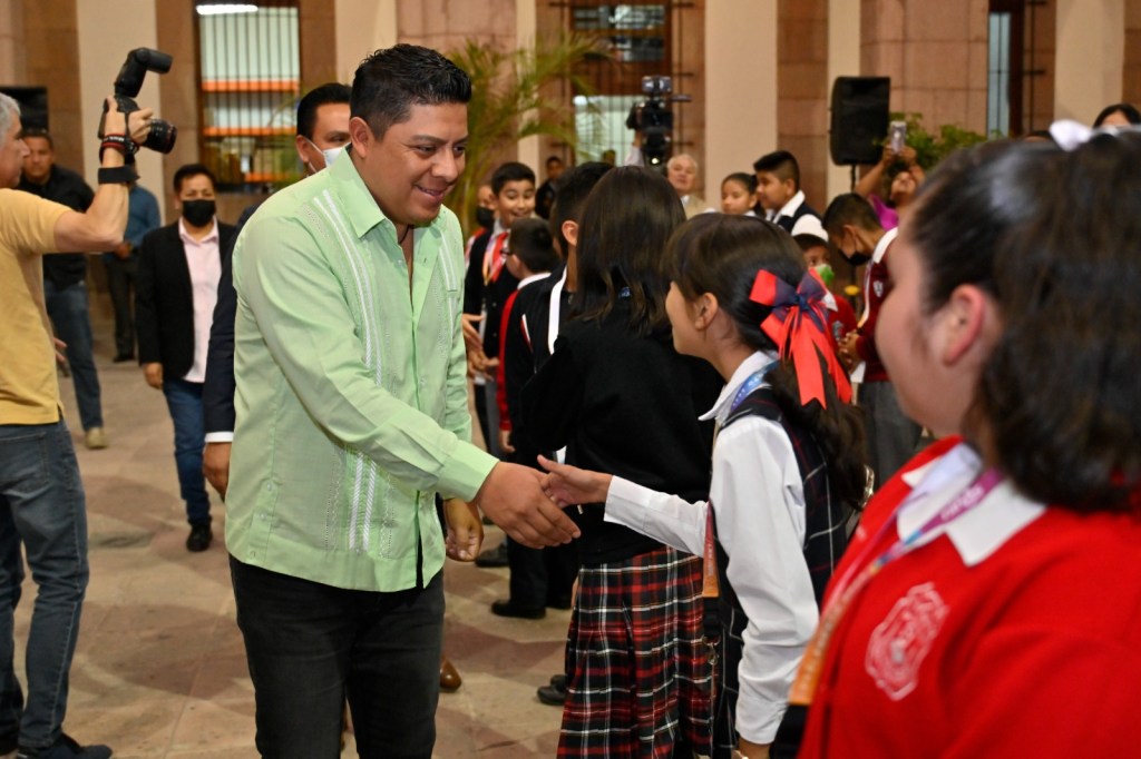 Con la alegría y curiosidad características de la niñez, en Palacio de Gobierno, recibió a estudiantes de quinto y sexto de primaria, tanto de escuelas públicas como particulares de los 15 distritos electorales y de las 12 posiciones de representación proporcional, para recibir de manos del Mandatario Estatal como obsequio, un reloj, como símbolo del tiempo y la vida, porque en la niñez nacen los sueños y con el tiempo se hacen realidad.