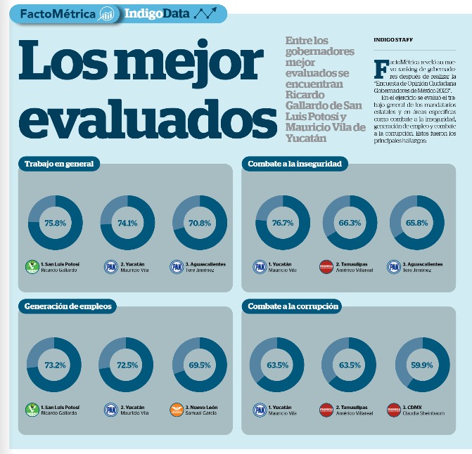 La publicación difundida por el medio nacional, con cifras de la Encuesta de Opinión Ciudadana Gobernadores de México 2023, de FactoMétrica, reveló que el Gobernador de San Luis Potosí, compartió pódium con Guillermo Vilas de Yucatán y Ma. Teresa Jiméne de Aguascalientes, gracias a la calificación positiva de la ciudadanía.