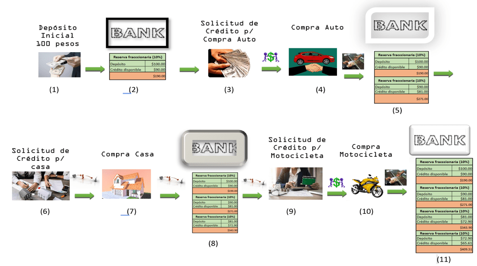 virtualmente— los $100.00 dólares depositados. El banco, con tu depósito de $100.00 dólares (1), ha generado $90.00 dólares que utilizará para préstamo (2). Ahora, un cliente “X” del banco solicita y recibe un crédito para comprar un auto, y utilizará tu moneda para pagar (3). El vendedor del auto (“A”) deposita en su banco el pago recibido. El banco nuevamente toma su depósito ($90.00), y aplica la R.F. de 10% ($9.00), por lo que este segundo banco dispondrá de $81.00 dólares para préstamo. Ahora los bancos tendrían un registro contable de ¡$271.00! dólares (5). Al tiempo que (“A”) deposita o transfiere al banco la moneda por la venta del auto, el cliente “Y” solicita crédito para compra de una casa (6). El banco autoriza el préstamo y hace la transferencia correspondiente. El comprador “Y” efectúa la adquisición de la vivienda (a “B”) (7) y el banco toma los $81.00 dólares, y aplica la R.F. del 10% ($8.10), por lo que el banco tendrá los $72.90 dólares para préstamos. De esta forma, en registros contables, los $100.00 dólares originales habrían “generado” $343.90 dólares (8). El nuevo banco otorga un préstamo al cliente “Z” para adquirir una motocicleta a “C”; se autoriza el crédito y se le transfiere el monto solicitado; hace la compra y a su vez transfiere el monto pactado a la cuenta del vendedor (“C”). El banco recibe $72.90 y repite la operación dejando el 10% como R.F., ($7.29) y disponiendo de $65.61 dólares para préstamo. Los $100.00 dólares originales ya han acumulado $409.51 en registros contables (11). De continuarse ese esquema se crearían hasta $1000.00 dólares respaldados por $100.00 dólares originales, considerando una R.F. de 10%. Es, guardadas todas las proporciones, la multiplicación milagrosa de los panes.