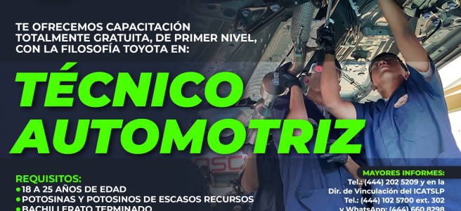 Ante el crecimiento económico que se espera en San Luis Potosí en los próximos meses con la llegada de nuevas empresas, el Instituto de Capacitación para el Trabajo (Icat), en coordinación con Toyota Sales de México, Casa Don Bosco, GP Strategies y Megadealer, lanzará un programa de formación automotriz gratuito, dirigido a jóvenes de entre 18 y 25 años en situación vulnerable que cuenten con el bachillerato concluido.