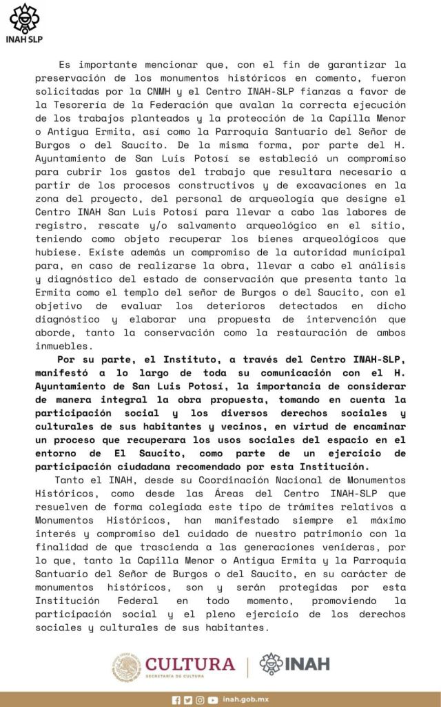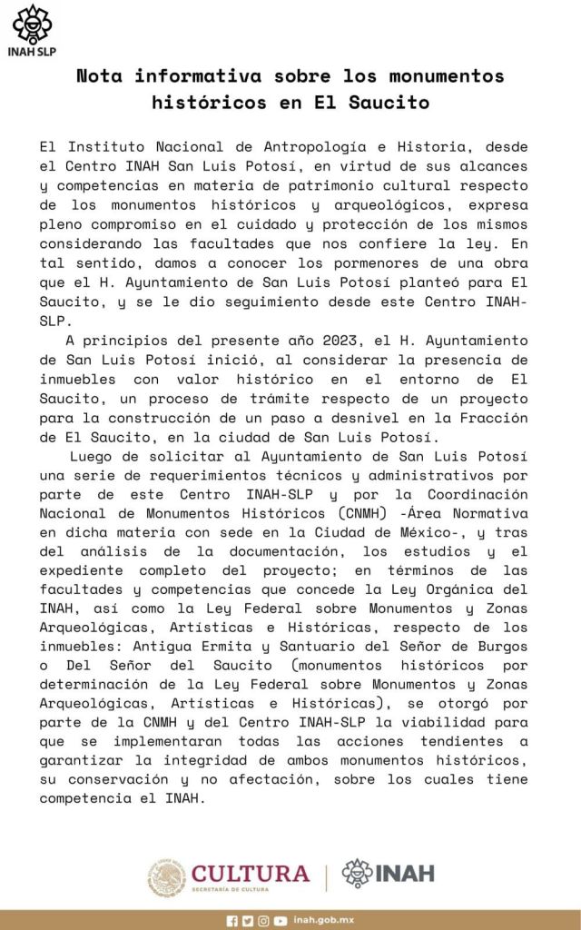 La obra del paso a desnivel del Saucito, que realizará el Ayuntamiento de San Luis Potosí en el norte de la ciudad, cuenta con el aval del Instituto Nacional de Antropología e Historia (INAH) del Gobierno de México, por lo que “tanto la Capilla Menor o Antigua Ermita y la Parroquia Santuario del Señor de Burgos o del Saucito, en su carácter de monumentos históricos, son y serán protegidos en todo momento”, según explicó la institución federal en un comunicado.