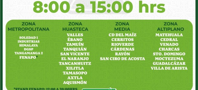 En la zona metropolitana, darán servicio las oficinas que se ubican en Soledad 1, Industrias, Himalaya, Eje Vial (Dirección General de Seguridad Pública), Tangamanga 2 y en la Fenapo. En la Zona Huasteca, las oficinas de Ciudad Valles, Ébano, Tamuín, Tanquián, San Vicente, Aquismón, El Naranjo, Tancanhuitz, Xilitla, Tamasopo y Axtla de Terrazas. En la zona media: Ciudad del Maíz, Cerritos, Rioverde, Cárdenas, Rayón y San Ciro de Acosta y en la zona Altiplano: Guadalcázar, Matehuala, Cedral, Venado, Charcas, Moctezuma, Santo Domingo y Villa de Arista.