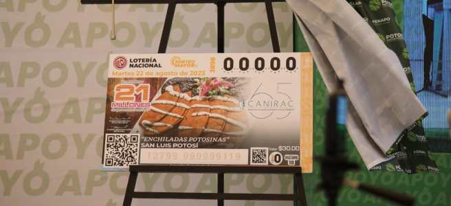 Desde abril de este año, en el marco del 65 aniversario de la Cámara Nacional de la Industria de Restaurantes y Alimentos Condimentados en San Luis Potosí (Canirac), mediante un convenio con la Lotería Nacional, se imprimen y venden cachitos que incluyen 32 platillos típicos, uno por cada Entidad, siendo la enchilada Potosina la que representa a las y los potosinos, con el objetivo de promover la amplia diversidad gastronómica de México.