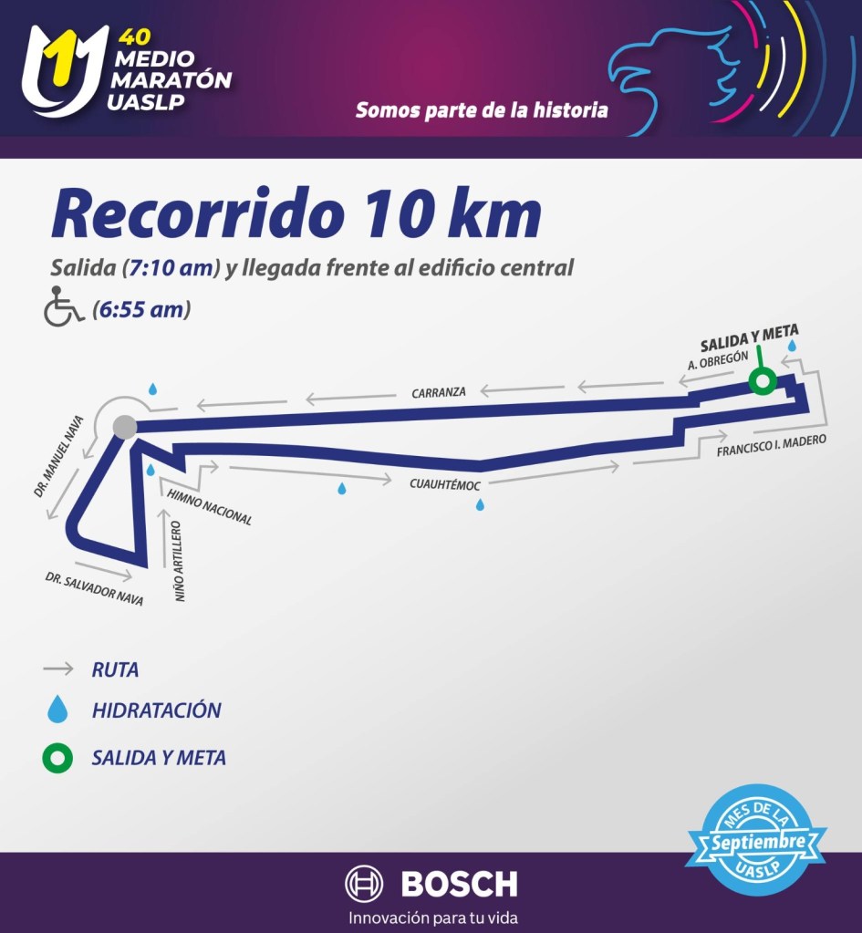 Para quienes prefieran una distancia más corta, pero igualmente emocionante, la categoría de 10 kilómetros comenzará a las 7:10 horas, compartiendo la salida y meta con la categoría principal. El recorrido seguirá una ruta similar, pasando por la Avenida Himno Nacional y Cuauhtémoc antes de incorporarse a Francisco I. Madero y culminar frente al Edificio Central de la UASLP.