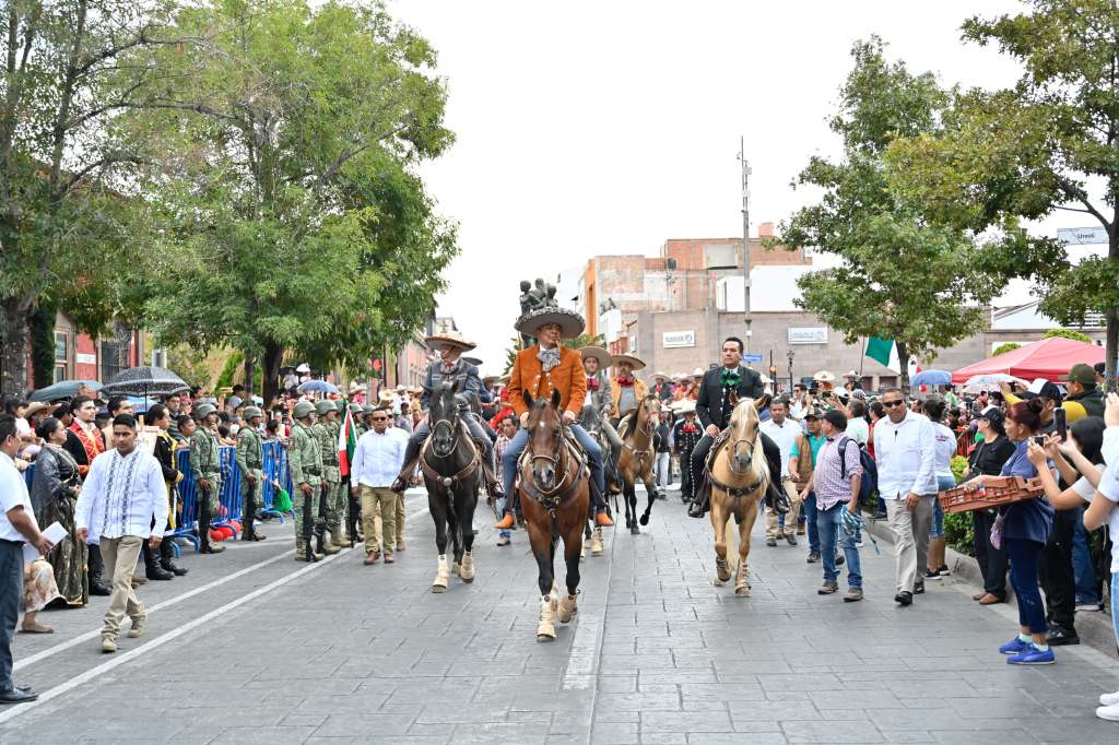 A lo largo del trayecto desfilaron 109 vehículos y 57 caballos en un contingente en el que participaron miembros de la Asociación de Charros del Estado; motociclistas de la Guardia Nacional y de la Secretaría de Seguridad y Protección Ciudadana del Estado (SSPCE); Bandera de México (en vehículo descubierto); agrupamientos de Cultura y Planteles Educativos; agrupamientos militar; de la SSPCE; de la Secretaria de Seguridad y Protección Ciudadana Pública Municipal; Cuerpo de Bomberos; Protección Civil Estatal, Cruz Roja, Ambulancias ARSO, entre otros.
