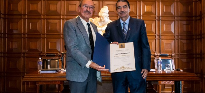 Conforme al orden del día, el doctor Magdaleno Medina Noyola, investigador del Instituto de Física y ex director del mismo, recibió el nombramiento de Profesor Emérito, por su gran trayectoria académica y de investigación a nivel nacional e internacional.
