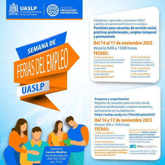 La Universidad Autónoma de San Luis Potosí a través de la División de Vinculación Universitaria llevará a cabo del 14 al 17 de noviembre de 2023, la Semana de Ferias del Empleo UASLP, en los campus universitarios en un horario de 09:00 a 13:00 horas.