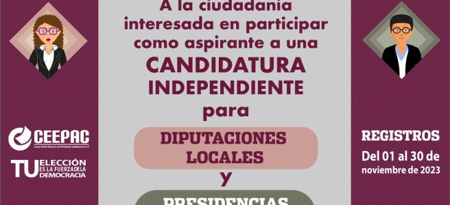El Consejo Estatal Electoral y de Participación Ciudadana de San Luis Potosí (CEEPAC) reitera que el próximo 30 de noviembre de 2023 es la fecha límite para el registro de aspirantes a candidaturas independientes en el marco del proceso electoral 2024. Esta convocatoria está abierta a la ciudadanía interesada en postularse para cargos de diputaciones y presidencias municipales.