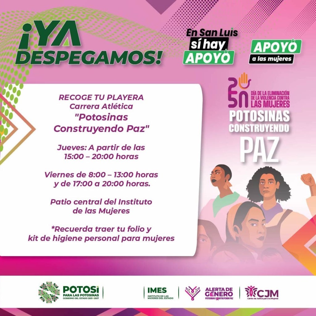 La carrera atlética con causa “Potosinas Construyendo Paz 2023”, en el parque Tangamanga II con salida y meta en la zona Kids a las 8:00 horas. Para la inscripción de esta justa deportiva las y los interesados donan un kit de higiene personal para mujeres, que pueden ser: shampoo, jabón de tocador, desodorante, papel higiénico, crema corporal, pasta, cepillo de dientes, entre otros, que se entregarán a usuarias del Sistema Estatal para el Desarrollo Integral de la Familia (DIF) y de los albergues del Centro de Justicia para las Mujeres (CJM) en Rioverde, Matehuala y Matlapa.