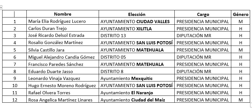 Durante la etapa de registro se recibieron 12 solicitudes: 9 de ellas para Presidencias Municipales y 3 para Diputaciones Locales de Mayoría Relativa, en las siguientes demarcaciones: