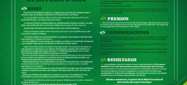 El Gobierno del Estado, a través de la Feria Nacional Potosina (Fenapo), publicó la convocatoria dirigida a artistas y creadores potosinos para crear el tema oficial de la edición 2024 de la gran fiesta de las y los potosinos.