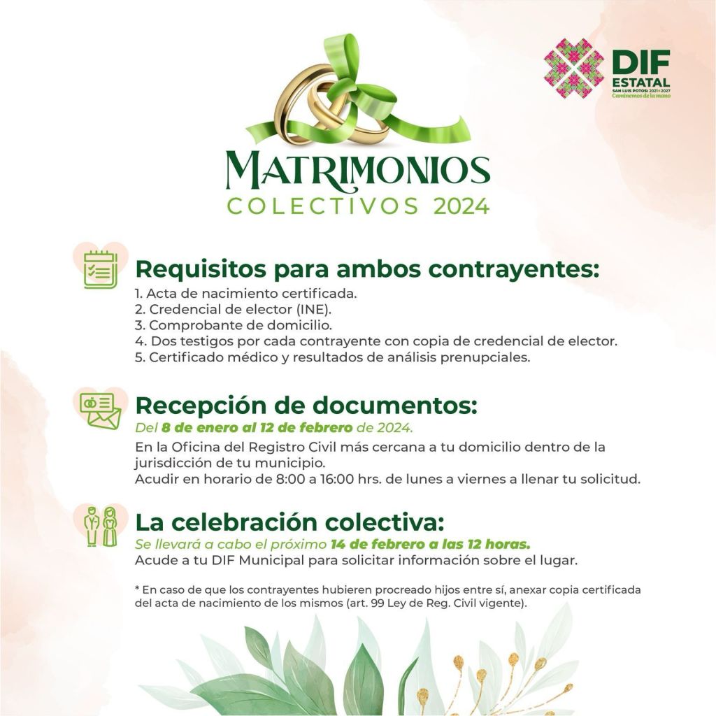 En apoyo a las parejas que desean formalizar legalmente su relación, el Sistema Estatal para el Desarrollo Integral de la Familia (DIF), que dirige la presidenta honoraria Ruth González Silva, mantendrá la inscripción para la campaña de Matrimonios Colectivos Gratuitos 2024, hasta el 12 de febrero, por lo que se invita a las y los interesados a acercarse a las oficinas del Registro Civil más cercanas a su domicilio para inscribirse.