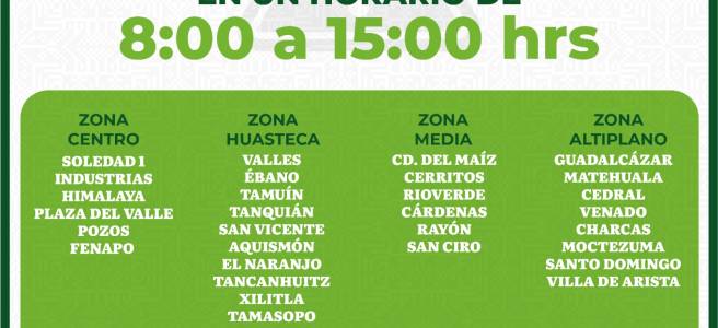 Añadió que en la zona metropolitana brindarán servicios las oficinas de Soledad 1, Industrias, Himalaya, Plaza del Valle, Pozos y Fenapo; en la Huasteca: Ciudad Valles, Ébano, Tamuín, Tanquián, San Vicente, Aquismón, El Naranjo, Tancanhuitz, Xilitla, Tamasopo, Axtla de Terrazas y Tamazunchale; en la región Media brindará servicio las oficinas de Ciudad del Maíz, Cerritos, Rioverde, Cárdenas, Rayón, San Ciro de Acosta y en el Altiplano las de Guadalcázar, Matehuala, Cedral, Venado, Charcas, Moctezuma, Santo Domingo y Villa de Arista.