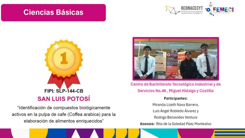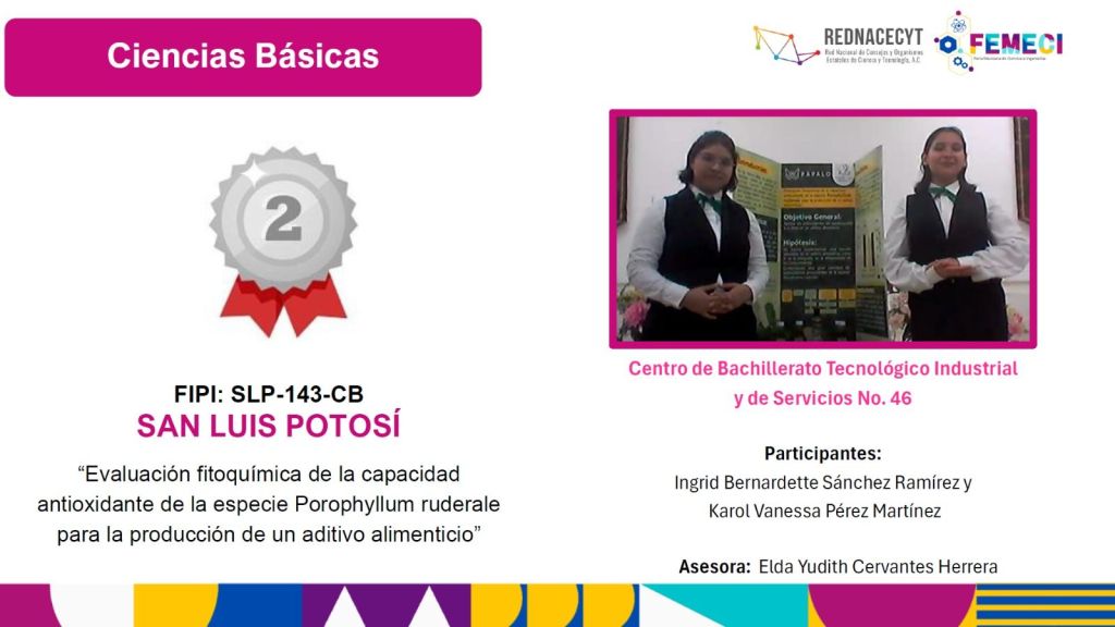 Rosalba Medina Rivera, directora del Copocyt y también presidenta de la Red Nacional de Consejo y Organismos Estatales de Ciencia y Tecnología (Rednacecyt), organismo que coordina la Femeci, informó que los proyectos ganadores del primer y segundo lugar en el área de ciencias básicas corresponden al Centro de Bachillerato Tecnológico Industrial y de Servicios (Cbtis), número 46 de Ciudad Valles. Asimismo, el primer lugar en el área de ciencias sociales fue otorgado al Colegio de Bachilleres Plantel 20 de Rioverde.