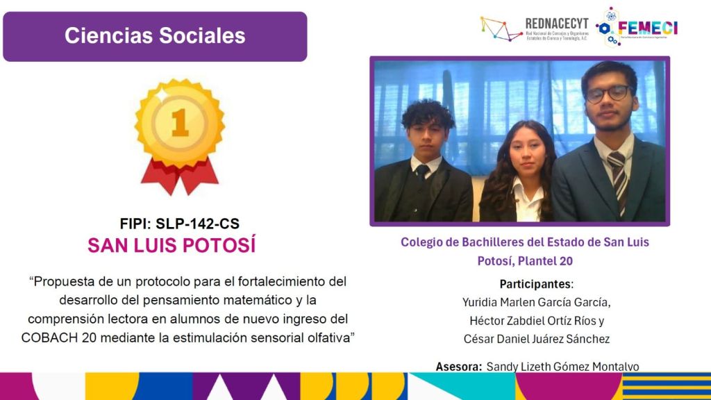 El Consejo Potosino de Ciencia y Tecnología (Copocyt), reconoció a las y los estudiantes potosinos ganadores en la Feria Mexicana de Ciencias e Ingenierías 2024 (Femeci), que se celebró de manera virtual del 7 al 9 de febrero del presente año, donde San Luis Potosí obtuvo dos primeros lugares y un segundo lugar nacional, de los seis proyectos representantes del Estado.