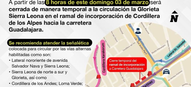 El Ayuntamiento de San Luis Potosí, a través de la Dirección de Obras Públicas informa a la ciudadanía que a partir de las 8 horas de este domingo 3 de marzo será cerrada a la circulación la Glorieta Sierra Leona en el ramal de incorporación de Cordillera de los Alpes hacia la carretera Guadalajara.