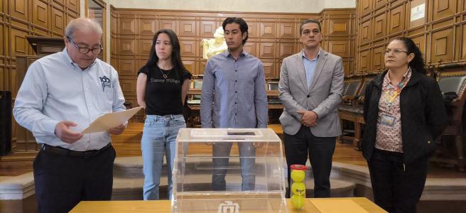 Para dar legalidad al sorteo de insaculación que dirigió el maestro Federico Garza Herrera, en su carácter de Secretario General de la UASLP, se contó con la asistencia del licenciado Isaac Lara Azuara, como representante de los directores, de la doctora Sandra Edith Nava Muñoz, representante de personal académico, el estudiante Joksan Cuello Carrizales, con la representación de las y los estudiantes, la presidenta de la Federación Universitaria Potosina, Miroslava Giselle González Sánchez y de la Asociación de Padres, Madres y Tutores, la vicepresidenta Atzimba Reséndiz Terán.