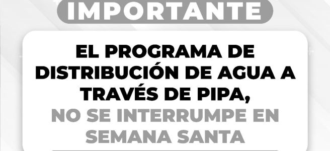 El Organismo Operador de Agua Potable, Alcantarillado y Saneamiento, INTERAPAS informa que estos días de Semana Santa el programa de distribución de agua a través de pipas no se verá interrumpido y se trabajará de manera normal.