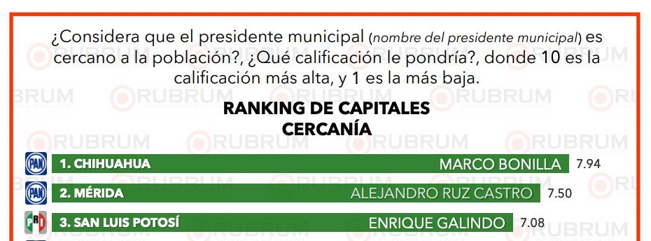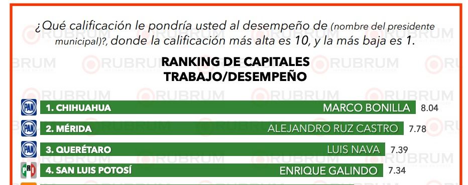 alcalde de San Luis Potosí, destacó nuevamente entre los mejor evaluados del país, de acuerdo con la encuesta que realiza mensualmente la empresa Rubrum a los presidentes municipales de las capitales del país, pues en el estudio correspondiente a abril de este año, se colocó en tercer puesto nacional en el rubro de cercanía con los ciudadanos; así como en cuarto lugar respecto al trabajo y desempeño, además de los servicios públicos; y en quinto lugar en la percepción de seguridad de las y los potosinos.