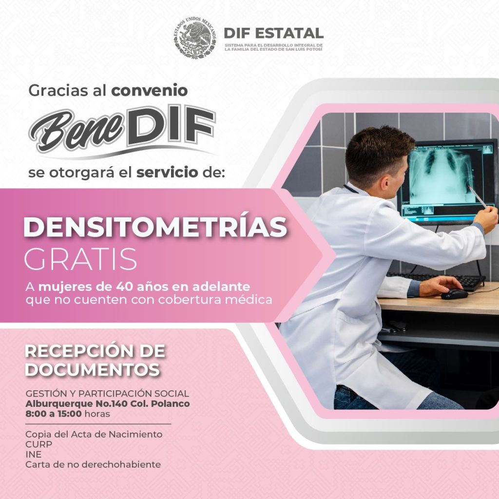 Para acceder a estos servicios gratuitos que se realizan en la Bene San Luis, se solicita a las y los potosinos interesados acudir a la Coordinación de Gestión y Participación Social del DIF Estatal, en Alburquerque 140, colonia Polanco, con copia de acta de nacimiento, INE, CURP y carta de no derechohabiencia, en horario de 8:00 a 15:00 horas, de lunes a viernes.