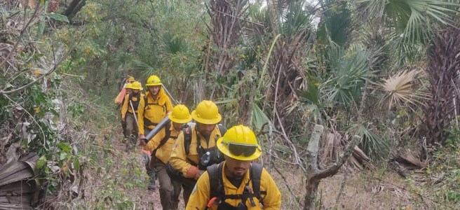 La dependencia detalló que, en Laguna de Patos, trabajan 150 brigadistas de la Comisión Nacional Forestal (Conafor), Secretaría de la Defensa Nacional (Sedena), Guardia Nacional, Protección Civil del Estado y de los municipios de Ciudad del Maíz, El Naranjo y Rioverde, además de brigadistas comunitarios, apoyados con dos aeronaves: un M1 del ejército y uno más del Gobierno del Estado.