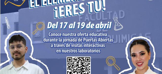 A través de visitas interactivas a los laboratorios de la Facultad de Ciencias Químicas (FCQ) de la Universidad Autónoma de San Luis Potosí (UASLP), las y los estudiantes de preparatoria podrán conocer la oferta educativa del plantel durante la jornada de Puertas Abiertas “El elemento principal ¡Eres tú!”, que se realizará del 17 al 19 de abril, de las 11:00 a las 15:00 horas.
