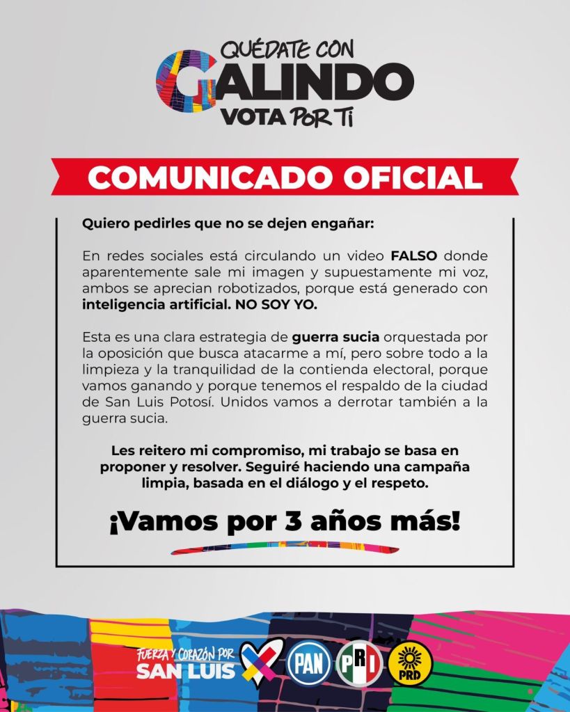 Adicionalmente, dijo que solicitó a su equipo jurídico de campaña, tratándose del primer caso de inteligencia artificial empleada en una guerra sucia contra un candidato en una campaña activa, “que explore la posibilidad de elevar denuncias en el ámbito federal, que dé a conocer el caso ante el INE -porque debe de haber advertencias, prevención y previsiones para que no se repita en otros lugares del país- y también ante el Consejo Estatal Electoral y de Participación Ciudadana (CEEPAC) en San Luis Potosí”.