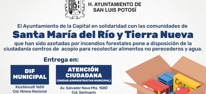 El Gobierno de la Capital, da a conocer que abrió dos centros de acopio para que las potosinas y potosinos donen alimentos no perecederos y agua embotellada, en favor de los habitantes de Santa María del Río y Tierra Nueva, quienes se han visto afectados por los recientes incendios forestales.