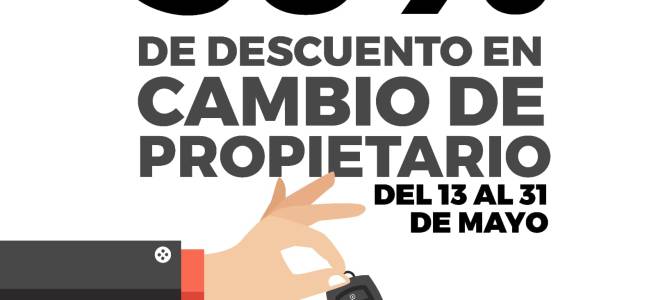 El trámite de cambio de propietario tendrá un descuento del 50 por ciento directamente en las oficinas recaudadoras. Los requisitos para la realización de este trámite son: Factura original, identificación oficial vigente (INE o Pasaporte), comprobante de domicilio: agua, luz, teléfono, internet, cable, predial, gas no mayor a tres meses de antigüedad, tarjeta de circulación, ambas placas metálicas, formato de alta para registro vehicular con los datos y firmas requeridas.