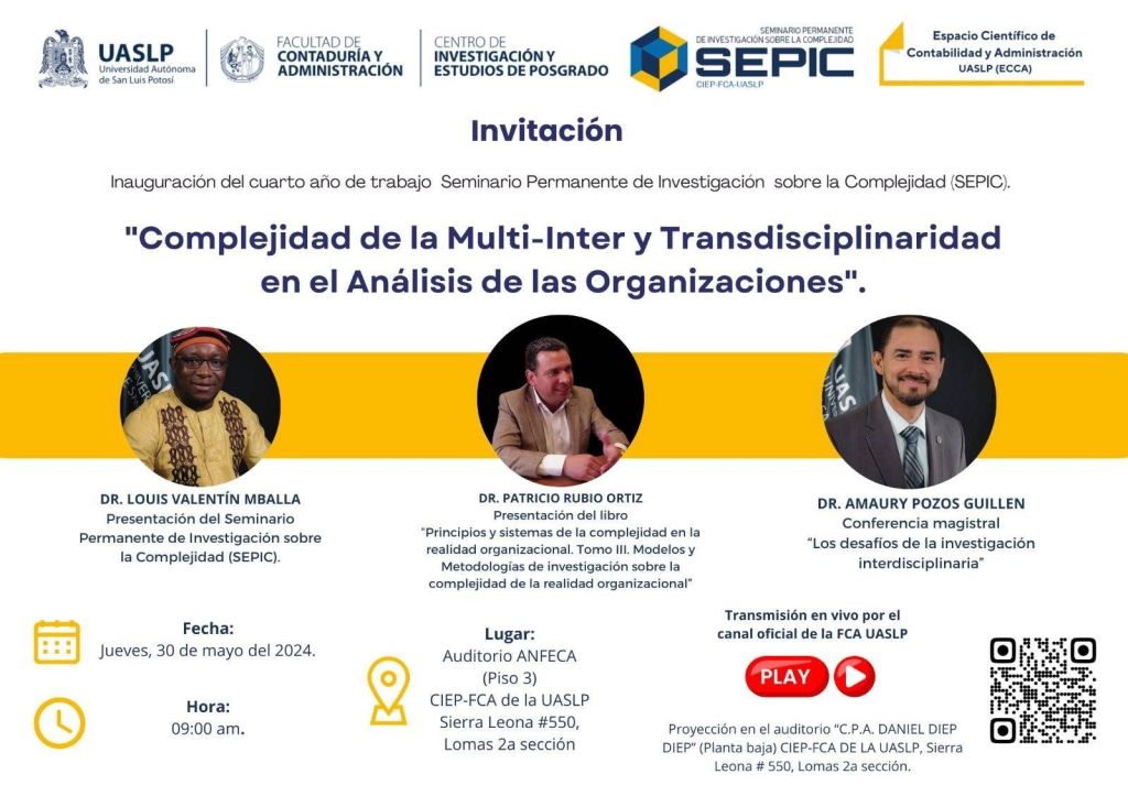 Bajo el concepto de “Multi, inter y transdisciplinariedad en el análisis de las organizaciones”, a partir del próximo jueves 30 de mayo arrancarán los trabajos por cuarto año consecutivo del Seminario Permanente de Investigación sobre la Complejidad (SEPIC). Este tiene como sede el Centro de Investigación y Estudios de Posgrado (CIEP) de la Facultad de Contaduría y Administración (FCA) de la Universidad Autónoma de San Luis Potosí (UASLP).