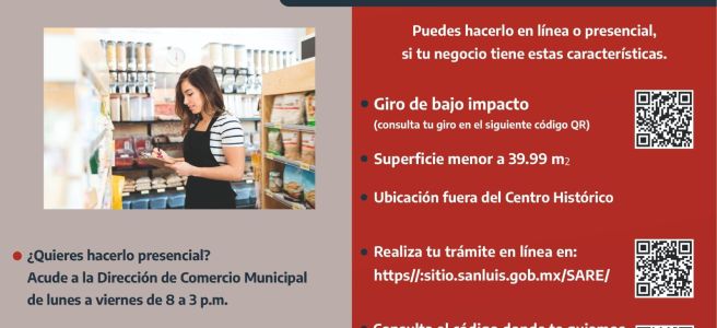 El gobierno municipal de San Luis Potosí informó que el SARE es el Sistema de Apertura Rápida de Empresas actualizado, que tiene la finalidad de agilizar trámites para la apertura de negocios de bajo impacto.