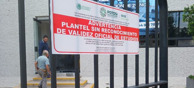 En seguimiento a la visita de vigilancia extraordinaria iniciada por la Secretaría de Educación de Gobierno del Estado (SEGE) en contra de la persona moral Universidad Potosina S.C., este jueves fueron colocados sellos de advertencia de que dicho plantel no cuenta con un Reconocimiento de Validez Oficial de Estudios (RVOE), que respaldara legalmente el publicitar e impartir estudios de nivel superior, de las carreras de Licenciatura en Médico General, Licenciatura en Gastronomía, Licenciatura en Estomatología y Licenciatura en Psicología.
