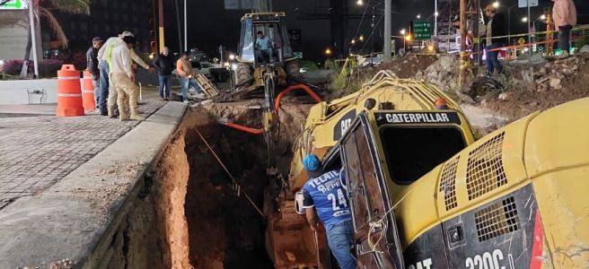 Personal de Construcción del Organismo Operador del Agua, Interapas, mantiene las maniobras de rehabilitación en el fraccionamiento Lomas del Tecnológico para sustituir 36 metros de tuberías de 8 y 18 pulgadas de diámetro y un ducto pluvial de 36 pulgadas, colocadas a 6 metros de profundidad.