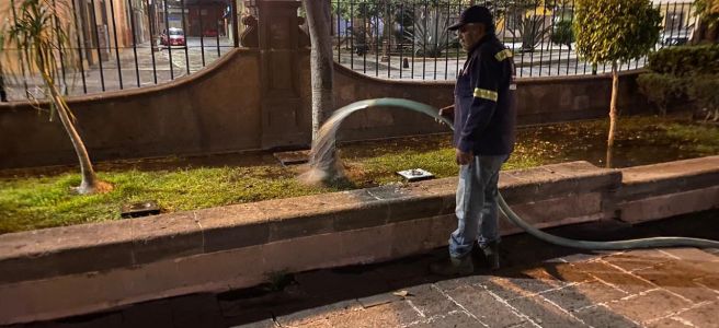 La Dirección de Servicios Municipales informó que personal de la Coordinación de Parques y Jardines trabajó en la limpieza del área y de la fuente en la Plaza Aranzazú, uno de los sitios más representativos de la Capital, por su belleza arquitectónica y su ubicación cercana a los edificios históricos del primer cuadro.