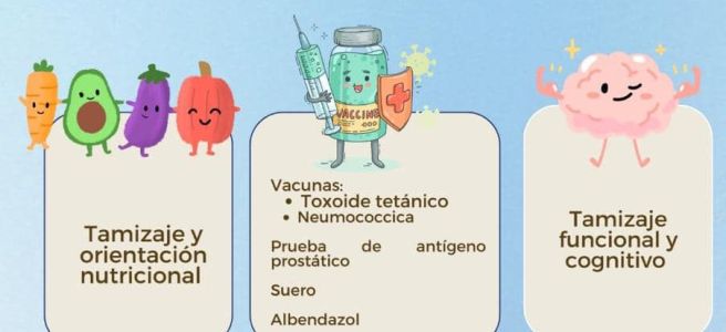 Entre los servicios que se otorgarán sin costo a quienes asistan se encuentran: tamizaje y orientación nutricional, tamizaje funcional y cognitivo, aplicación de vacunas contra tétanos y neumococo, así como pruebas de antígeno prostático para quienes la soliciten. Además se distribuirá suero y albendazol.