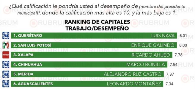 El Alcalde San Luis Capital, Enrique Galindo Ceballos, mantiene buenas calificaciones en el Ranking de Capitales de la encuestadora Rubrum, en la evaluación ciudadana de trabajo y desempeño, con una calificación de 8.0, lo que lo ubica en la segunda posición a nivel nacional, según los resultados correspondientes al mes de septiembre.